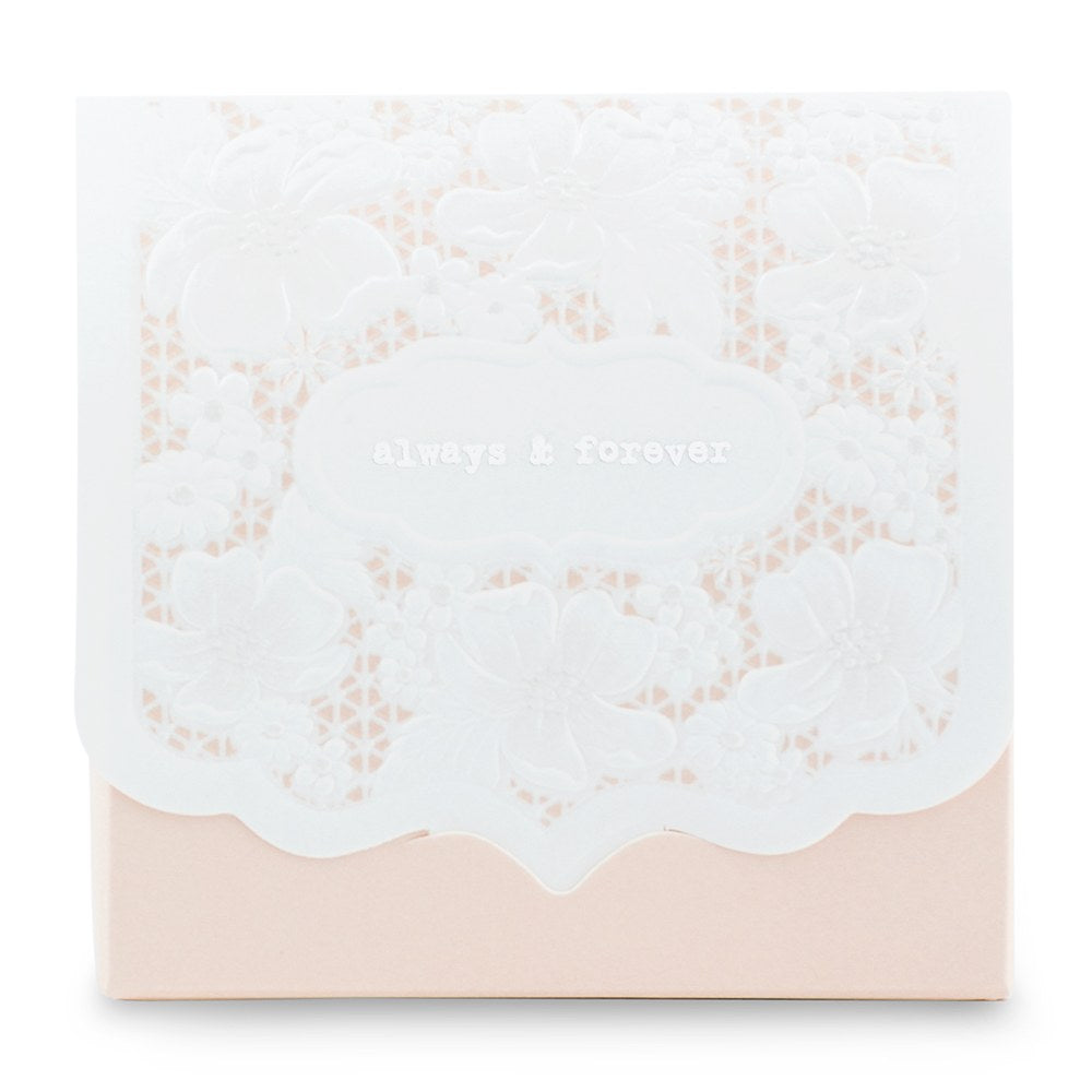 Doux et charmant décrivent cette petite boîte de faveur qui complétera une gamme de styles de mariage. La combinaison délicate de gaufrage et de couleur blush est tellement romantique, et le message "toujours et pour toujours" est la touche finale parfaite. Utilisez-le pour emballer une friandise ou un bibelot miniature, et vous pouvez être assuré que vos faveurs ne seront pas négligées.