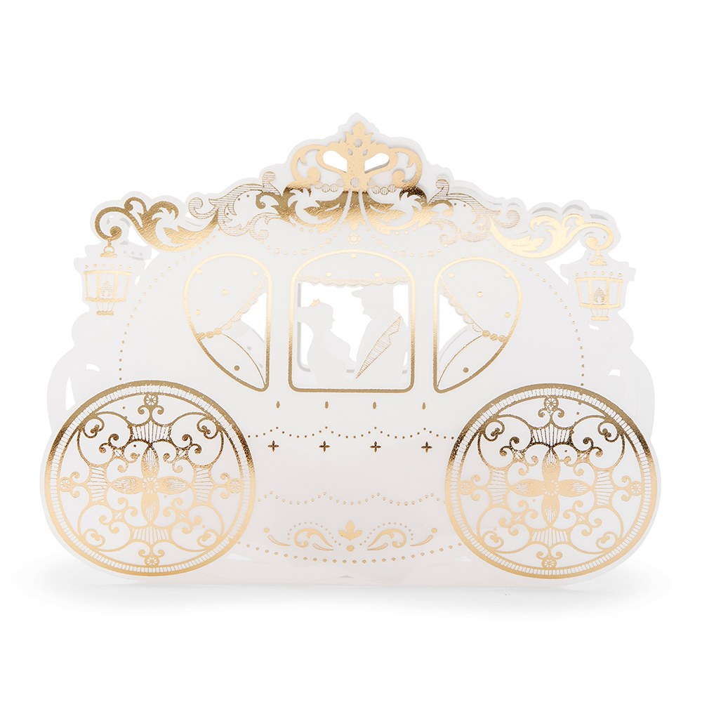 Transportez votre rêve de princesse d'un jour jusqu'à vos faveurs de mariage avec cette boîte à faveurs de style Cendrillon. Remplissez ces adorables petites calèches d'une friandise ou d'un bonbon que vos invités pourront ramener à la maison et en profiter longtemps après que l'horloge sonne midi. Avec votre prince charmant, rien ne dit plus un conte de fées qu'un carrosse de mariage et ces boîtes de faveur présentent des détails complexes qui feront de vos rêves de mariage une réalité !